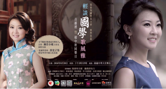 2016年起,陈佳凭借个人的文学修养和温婉高雅的书卷气质,被香港冯燊均国学基金会聘请为顾问,并在基金会推出的一系列国学节目《轻谈国学歌风雅》中担任主持人、撰稿人、音乐总监,用说与唱结合的方式传承优秀中华文化。